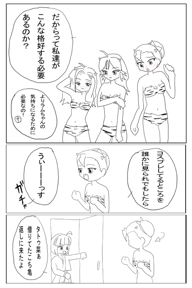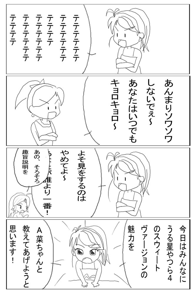 サ:イヤイヤ、しっかり説明するよ。あたるとラムちゃんが大喧嘩します。鬼ごっこをしてケリをつけるという話になるのですがあたるがラムちゃんを捕まえられなければラムちゃんとの記憶はなくなってしまう。捕まえられれば今まで通り。なんだけど、なかなかラムちゃんを捕まえられないあたるにラムちゃんは「好きと言ってくれたら捕まってあげるっちゃ」といいますがあたるは拒否します。