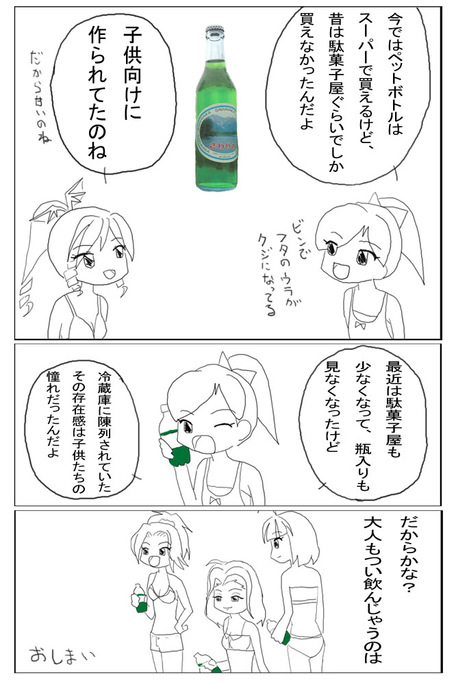 子供ながらに「もう一本」の当たりはいらないなぁと思っていました。他にもグレープ味がありますが意外と知名度が低いのでしょうか?「さわやかと言えばメロン味」の印象がつよいです。透き通った緑色がインパクトあったんですよね。