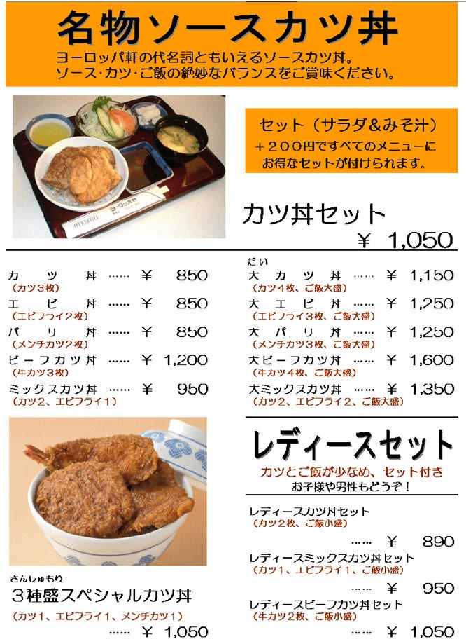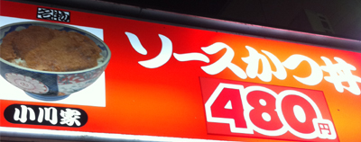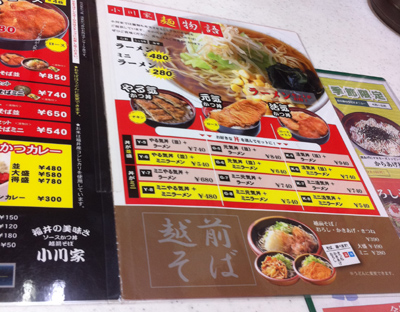 「ソースカツ丼の小川家」!ヨーロッパ軒がカツ丼を含む洋食屋ならばこちらは丼メイン。唐揚げ丼やソースカツカレー、さらには越前そばまで食べられてラーメンやうどんも食べられるっていうお店!どこに向かってくんだこの店は!w