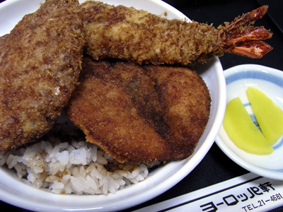 さてこちらは「ミックス丼」なのですが、海老フライの衣とカツの衣が全然違いますよね。