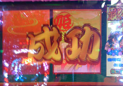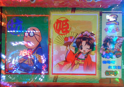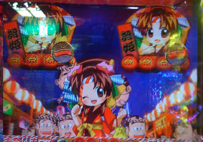 投資すること3k目。擬似×2から5テンパイで「ちゃんす」。岡っ引きリーチに発展して提灯に「あつーいお茶」。リーチ中に扇子ヤクモノが作動して舞姫リーチに。