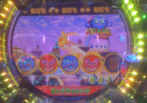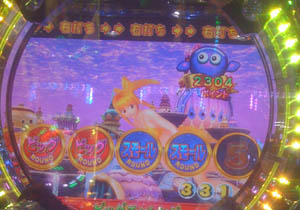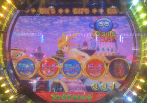 次の当たりは80回転過ぎたところで保留先読みのチャンス目×3後の4回転目は何事もなくスルー・・・・と思ったら、中段・下段ゾロ目から上段再始動のプレミアで「6」から「7」へ昇格!